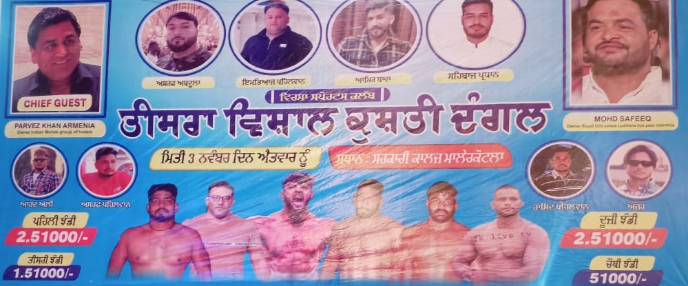 ਇਸੇ ਲੜੀ ਤਹਿਤ 03 ਨਵੰਬਰ ਨੂੰ ਸਰਕਾਰੀ ਕਾਲਜ ਮਲੇਰਕੋਟਲਾ ਵਿਖੇ ਵਿਰਸਾ ਸਪੋਰਟਸ ਕਲੱਬ ਵੱਲੋਂ ਤੀਸਰਾ ਵਿਸ਼ਾਲ ਕੁਸ਼ਤੀ ਦੰਗਲ ਕਰਵਾਇਆ ਜਾ ਰਿਹਾ ਹੈ । ਪ੍ਰੈਸ ਨਾਲ ਗੱਲਬਾਤ ਕਰਦੇ ਹੋਏ ਕਲੱਬ ਦੇ ਪ੍ਰਧਾਨ ਸ਼ਹਿਬਾਜ਼, ਆਮਿਰ ਬਾਵਾ, ਅਨਵਰ ਪੱਮੀ, ਇਮਤਿਆਜ਼ ਪਹਿਲਵਾਨ ਨੇ ਦੱਸਿਆ ਕਿ ਇਸ ਕੁਸ਼ਤੀ ਦੰਗਲ ਵਿੱਚ ਦੇਸ਼ ਦੇ ਨਾਮੀ ਪਹਿਲਵਾਨ ਹਿੱਸਾ ਲੈ ਰਹੇ ਹਨ । ਦੰਗਲ ਵਿੱਚ ਪਹਿਲੀ ਝੰਡੀ 2,51,00 ਰੁਪਏ, ਦੂਜੀ ਝੰਡੀ 2,51,00 ਰੁਪਏ, ਤੀਜੀ ਝੰਡੀ 1,51,000 ਰੁਪਏ ਅਤੇ ਚੌਥੀ ਝੰਡੀ 51 ਹਜ਼ਾਰ ਰੁਪਏ ਦੀ ਹੋਵੇਗੀ । ਉਹਨਾਂ ਦੱਸਿਆ ਕਿ ਕੁਸ਼ਤੀ ਦੰਗਲ ਦੇ ਮੁੱਖ ਮਹਿਮਾਨ ਪ੍ਰਵੇਜ਼ ਖਾਨ ਐਮਡੀ ਇੰਡੀਅਨ ਮਹਿਕ ਗਰੁੱਪ ਆਫ ਹੋਟਲਜ਼ ਅਰਮੀਨੀਆ ਹੋਣਗੇ ਅਤੇ ਵਿਸ਼ੇਸ਼ ਮਹਿਮਾਨ ਮੁਹੰਮਦ ਸ਼ਫੀਕ (ਐਮਡੀ ਰਾਇਲ ਹਿਲਜ਼ ਹੋਟਲ) ਹੋਣਗੇ । ਪ੍ਰੈਸ ਦੇ ਮਾਧਿਅਮ ਰਾਹੀਂ ਕੁਸ਼ਤੀ ਦੰਗਲ ਵਿੱਚ ਪਹੁੰਚਣ ਲਈ ਪ੍ਰਬੰਧਕ ਕਮੇਟੀ ਵੱਲੋਂ ਪੰਜਾਬ ਭਰ ਦੇ ਖੇਡ ਪ੍ਰੇਮੀਆਂ ਨੂੰ ਖੁੱਲ੍ਹਾ ਸੱਦਾ ਦਿਤਾ ਜਾਂਦਾ ਹੈ ।
