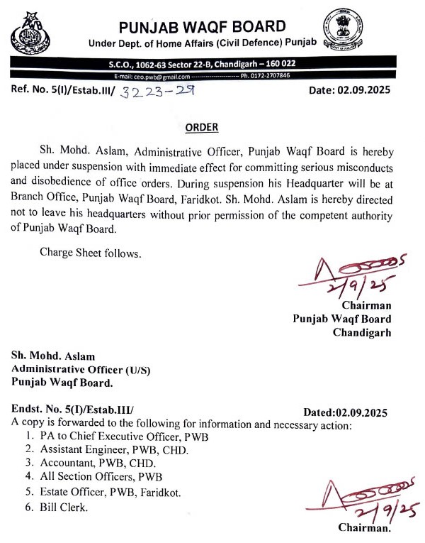 ਮਲੇਰਕੋਟਲਾ, 03 ਅਗਸਤ (ਅਬੂ ਜ਼ੈਦ): ਪੰਜਾਬ ਵਕਫ ਬੋਰਡ ਆਏ ਦਿਨ ਚਰਚਾ ਦਾ ਵਿਸ਼ਾ ਬਣਿਆ ਰਹਿੰਦਾ ਹੈ । ਇਸੇ ਲੜੀ ਤਹਿਤ ਪੰਜਾਬ ਵਕਫ਼ ਬੋਰਡ ਦੇ ਲੰਬੇ ਸਮੇਂ ਤੋਂ ਅਖੌਤੀ ਮਾਲਕ ਕਹੇ ਜਾਂਦੇ ਮੁਹੰਮਦ ਅਸਲਮ ਪ੍ਰਸ਼ਾਸਕੀ ਅਧਿਕਾਰੀ ਨੂੰ ਗੰਭੀਰ ਦੁਰਾਚਾਰ ਕਰਨ ਅਤੇ ਦਫ਼ਤਰੀ ਹੁਕਮਾਂ ਦੀ ਉਲੰਘਣਾ ਕਰਨ ਦੇ ਦੋਸ਼ ਹੇਠ ਤੁਰੰਤ ਪ੍ਰਭਾਵ ਨਾਲ ਮੁਅੱਤਲ ਕੀਤਾ ਗਿਆ ਹੈ। ਬੋਰਡ ਦੇ ਲੈਟਰ ਨੰਬਰ: 5(l)/Estab.lll/3223-29 ਮਿਤੀ:02.09.2025 ਰਾਹੀਂ ਹੁਕਮ ਜਾਰੀ ਕੀਤੇ ਗਏ ਹਨ । ਮੁਅੱਤਲੀ ਦੌਰਾਨ ਉਨ੍ਹਾਂ ਦਾ ਮੁੱਖ ਦਫਤਰ ਪੰਜਾਬ ਵਕਫ਼ ਬੋਰਡ ਫਰੀਦਕੋਟ ਦੇ ਸ਼ਾਖਾ ਦਫ਼ਤਰ ਵਿਖੇ ਹੋਵੇਗਾ । ਇਸ ਤੋਂ ਇਲਾਵਾ ਮੁਹੰਮਦ ਅਸਲਮ ਨੂੰ ਸਮਰੱਥ ਅਧਿਕਾਰੀ ਦੀ ਪੂਰਵ ਆਗਿਆ ਤੋਂ ਬਿਨਾ ਆਪਣਾ ਦਫਤਰ ਨਾ ਛੱਡਣ ਦਾ ਨਿਰਦੇਸ਼ ਦਿੱਤਾ ਗਿਆ ।